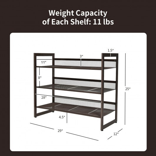 Specifications: Color: Brown Material: Steel 2-Tier Product imension: 29″ x 12″ x 17″ (L x W x H) 3-Tier Product dimension: 29″ x 12″ x 25″ (L x W x H) 4-Tier Product dimension: 29″ x 12″ x 32.5″ (L x W x H) Shelf dimension: 28″ x 11″ (L x W) Maximum weight of each shelf: 11 lbs Net weight: 13.5 lbs Package Includes: 1 x Shoe rack 1 x Instruction