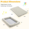 Specifications: Color: Gray Material: PVC + flocking Dimension of bed: 65″ x 46.5″ x 8″ (L x W x H) Dimension of mattress: 50.5″ x 31.5″ x 4.5″ (L x W x H) Net weight: 7.5 lbs Weight capacity: 330 lbs Recommended age: 18-24 Months Package includes: 1 x Inflatable travel bed 1 x Electric pump 1 x Repair kit 1 x Storage bag 1 x Instruction