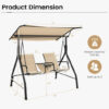 Specifications: Color: Beige Material: Fabric steel tempered glass Overall dimension: 69″ x 47″ x 67″ (L x W x H) Size of canopy: 71″ x 55″ (L x W) Size of each seat: 25.5″ x 20.5″ (L x W) Seat height from the ground: 22″ Net weight: 70.5 lbs Weight capacity: 530 lbs Package includes: 1 x Patio swing chair 1 x Instruction