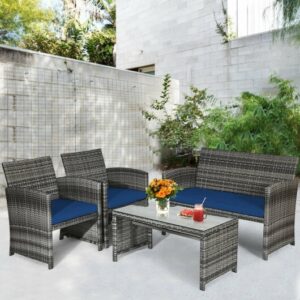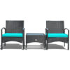 Specifications: Color Black/Turquoise/Red/Gray Rattan Material PE Material Polyester Sponge steel wicker Maximum load bearing of chair 330 Ibs Maximum load bearing of table 110 Ibs Size of chair 23.5″ x 23″ x 29″ (L x W x H) Size of table 19.5″ x 19.5″ x 15″ (L x W x H) Dimension of cushion 21″ x 18″ x 20″(L x W x H)