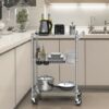Use it in your kitchen for serving meals or for storing your mixer bread machine and pots and pans. It holds computer equipment in the office towels in the bathroom or tools in the garage. The three tiers offer ample space to store your household essentials. The included wheels allow for easy mobility around your home and they can be locked for your convenience. Easy to care for just wipe with a clean damp cloth to keep it looking as good as new for years to come. Our utility cart is the best choice to bring convenience to life.