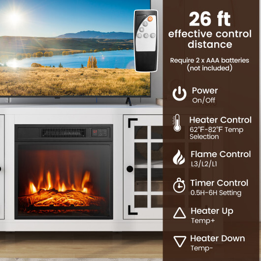 Specifications: Color: White/Black/Natural Material: MDF + Engineered Wood + Tempered Glass + Metal + Plastic Overall Dimension of TV Stand: 58″ x 16″ x 25″ (L x W x H) Dimension of Electric Fireplace: 19.17″ x 5.08″ x 17.52″ (W x D x H) Length of Power Cable: 6 ft Total Net Weight: 88 lbs Weight Capacity of Tabletop: 66 lbs Rated Power: 1400W Voltage: 120V Frequency: 60Hz Heat Output: 5000 BTU Heating Area: 400 sq.ft. Adjustable Flame Brightness: 3-level (L1 L2 L3) Adjustable Temperature: 62?F- 82?F Effective Control Distance of Remote Control: 26 ft Package Includes: 1 x TV Stand 1 x Electric Fireplace 1 x Remote Control 1 x Instruction