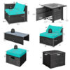 Specifications: Color of PE Rattan: Black Color of Cushion: Black/Gray/Navy/Red/Turquoise/Off White Material: PE Rattan Metal Tempered Glass Polyester Sponge Heat Output: 50 000 BTU Overall Dimension of Fire Pit Table: 32″ x 32″ x 25.5″ (L x W x H) Overall Dimension of Coffee Table: 39.5″ x 20″ x 13.5″ (L x W x H) Overall Dimension of Storage Box: 33.5″ x 29.5″ x 26″ (L x W x H) Overall Dimension of Each Ottoman: 17.5″ x 17.5″ x 16″ (L x W x H) Overall Dimension of Each Corner Sofa: 29.5″ x 29.5″ x 25.5″ (L x W x H) Overall Dimension of Each Armless Sofa: 28″ x 27″ x 25″ (L x W x H) Overall Dimension of Each Ottoman’s Cushion: 17.5″ x 17.5″ x 4″ (L x W x Thickness) Overall Dimension of Each Corner Sofa’s Back Cushion: 26″ x 14″ x 7″ (L x W x Thickness) Overall Dimension of Each Corner Sofa’s Seat Cushion: 25″ x 25″ x 4″ (L x W x Thickness) Overall Dimension of Each Armless Sofa’s Back Cushion: 27.5″ x 14″ x 7″ (L x W x Thickness) Overall Dimension of Each Armless Sofa’s Seat Cushion: 27″ x 25″ x 4″ (L x W x Thickness) Overall Dimension of Full Storage: 93″ x 29.5″ x 26″ (L x W x H) Seat Height from the Ground for Each Corner Sofa: 13.5″ Seat Height from the Ground for Each Armless Sofa: 12.5″ Net Weight of Fire Pit Table: 61 lbs Net Weight of Coffee Table: 23 lbs Net Weight of Storage Box: 22 lbs Net Weight of Each Ottoman: 10 lbs Net Weight of Each Corner Sofa: 20 lbs Net Weight of Each Armless Sofa: 18 lbs Weight Capacity of Fire Pit Table: 110 lbs Weight Capacity of Coffee Table: 165 lbs Weight Capacity of Each Ottoman: 350 lbs Weight Capacity of Each Corner Sofa: 350 lbs Weight Capacity of Each Armless Sofa: 350 lbs Package Includes: 1 x Fire Pit Table 1 x Bag of Lava Rock 1 x Coffee Table 1 x Storage Box 2 x Ottomans 2 x Corner Sofas 2 x Armless Sofas 2 x Ottoman’s Cushions 4 x Back Cushions 4 x Seat Cushions 2 x Waterproof Covers 2 x Instructions