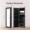 Specifications: Material: MDF board + glass mirror Color: Black/White/Brown Net weight: About 21 lbs Overall dimension: 14.5″ x 3.3″ x 53.5″ (L x W x H) Mirror size: 10.5″ x 43.5″ (L x W) The number of LED lights: 15 Power supply: 3 AAA (not included) Package include: 1 x Jewelry cabinet 2 x Keys